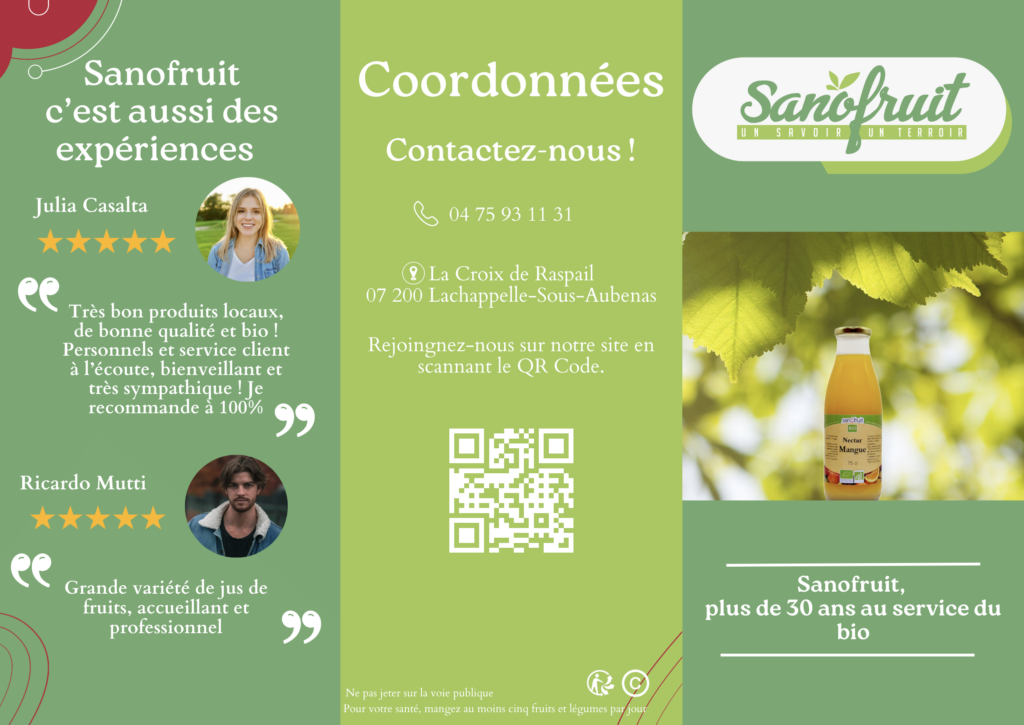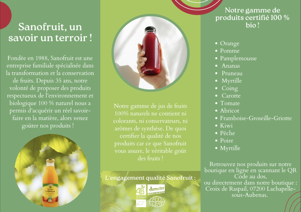 Dans le cadre d’un projet universitaire, j’ai réalisé un flyer et une affiche promotionnelle pour l’entreprise Sanofruit, spécialisée dans les jus de fruits biologiques. L’objectif de ce projet était de concevoir des supports de communication attractifs tout en respectant l’identité visuelle et la charte graphique de la marque. J’ai choisi d’utiliser des couleurs naturelles et fruitées, en cohérence avec l’univers visuel de Sanofruit, afin d’évoquer la fraîcheur, la qualité et l’authenticité de ses produits. La composition graphique met en avant les fruits et la vitalité qu’ils représentent, tout en maintenant une mise en page claire et équilibrée. Ce travail m’a permis de développer mes compétences en design graphique, communication visuelle et respect de l’identité de marque, tout en proposant des visuels à la fois dynamiques et harmonieux.
