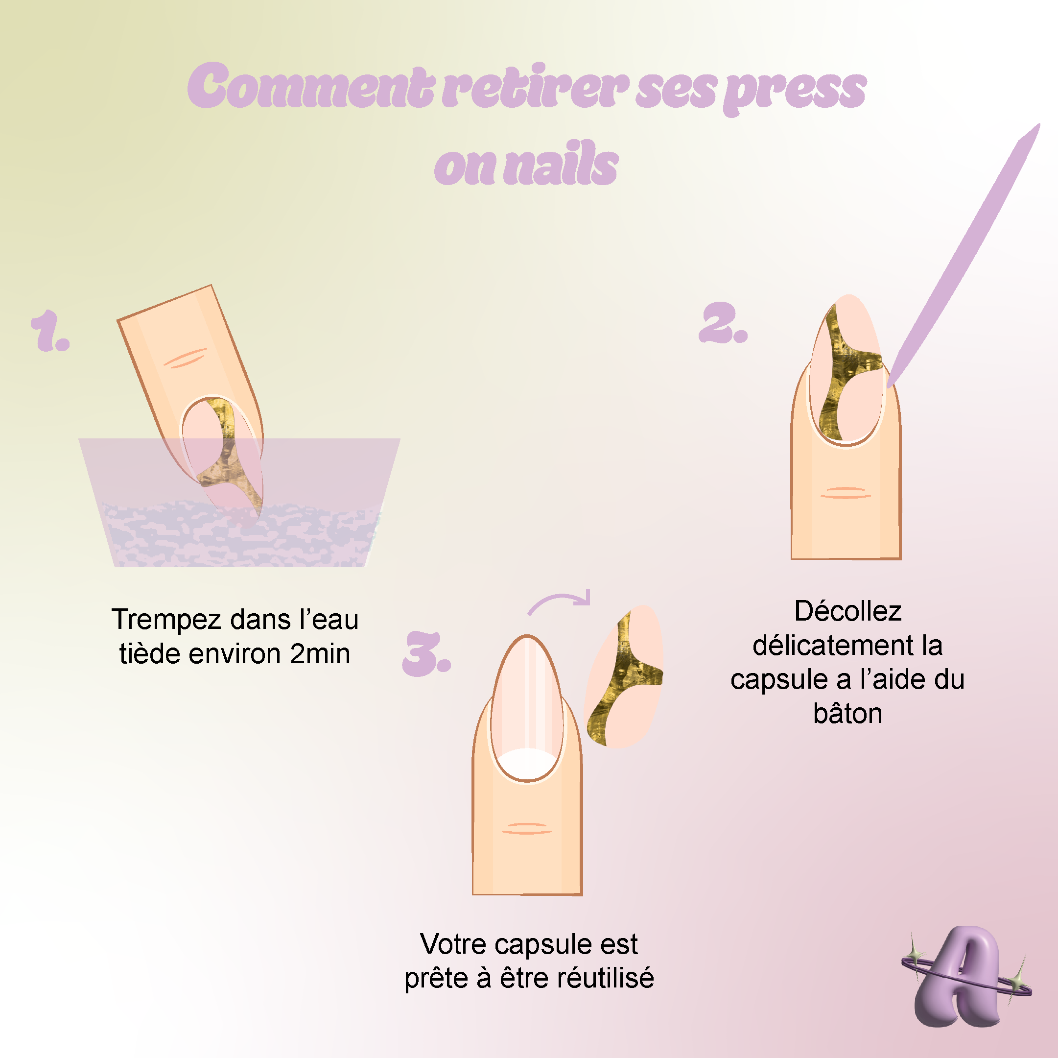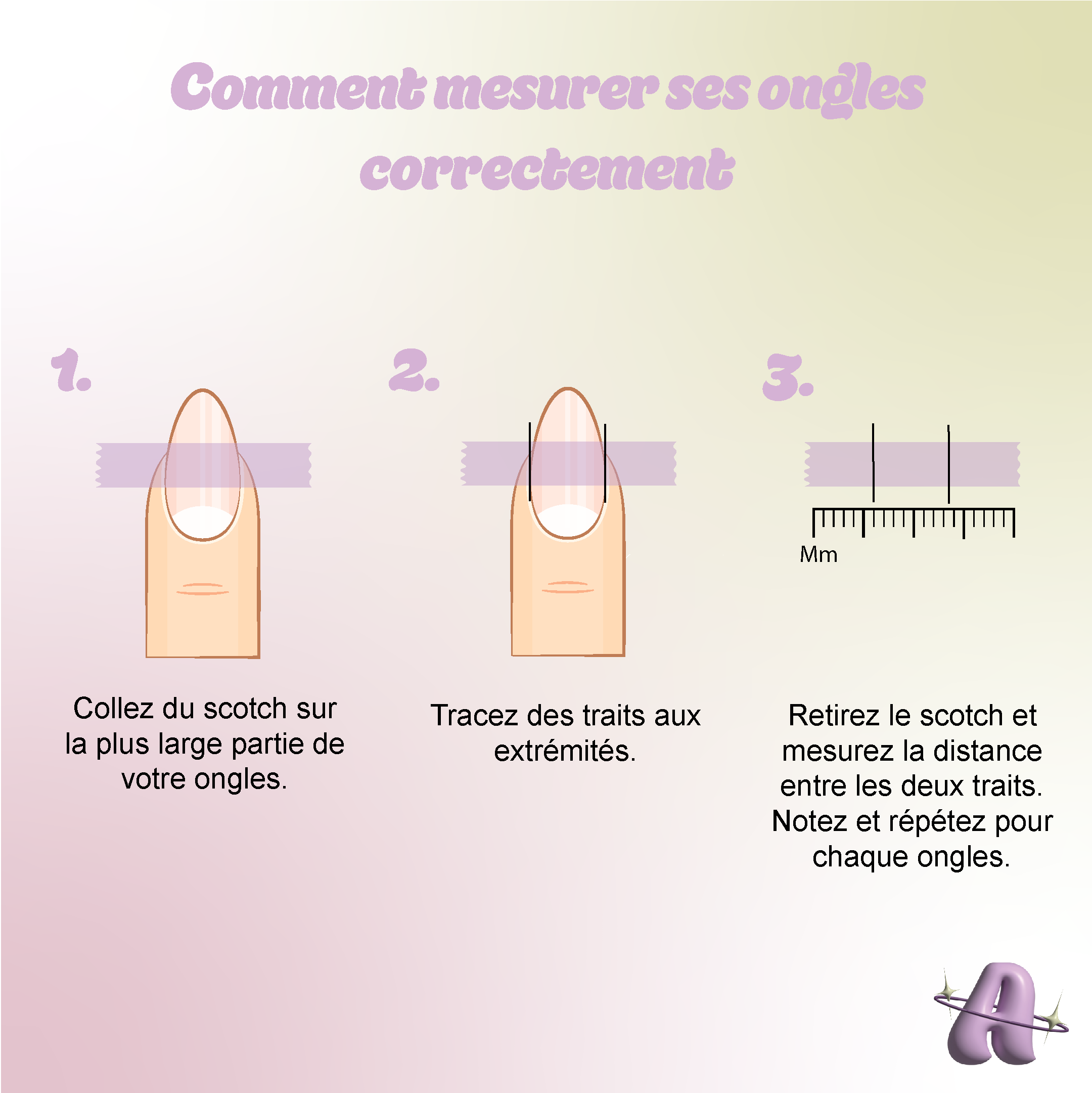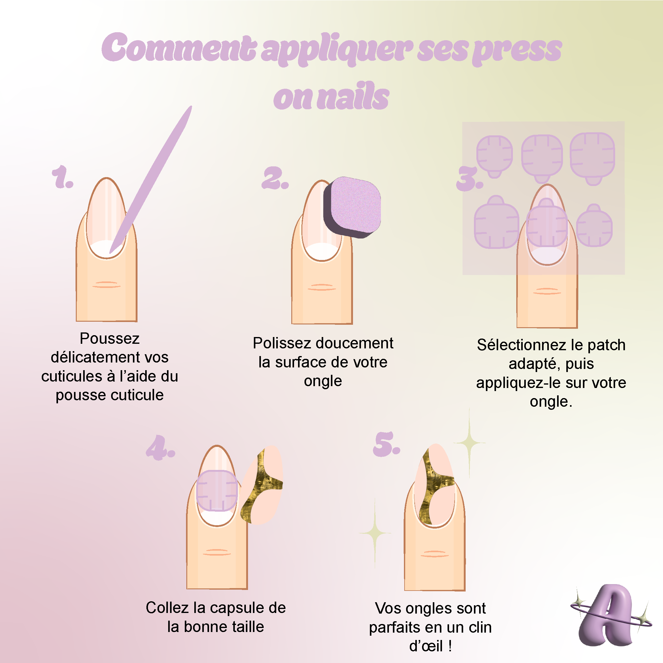 Dans le cadre de mon projet de capsules press-on nails personnalisables, j’ai également créé plusieurs publications pour Instagram au format tutoriel. L’objectif était de montrer les étapes pour mesurer l'ongle pour avoir la bonne taille de capsule, les étapes de pose mais aussi les étapes de dépose des capsules press on nails, tout en mettant en avant le design et l’univers visuel de la "marque". Ces publications permettent de rendre le contenu plus engageant, d’informer la communauté et de renforcer la présence de la "marque" sur les réseaux sociaux à travers un contenu à la fois esthétique et pédagogique.