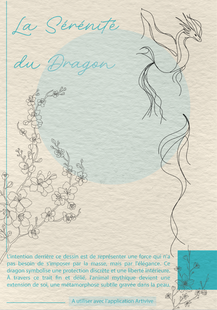 Réalisé dans un cadre universitaire, ce projet explore la synergie entre l'art ancestral du tatouage et les technologies émergentes. L'exercice consistait à intégrer la réalité augmentée (RA) pour enrichir l'expérience visuelle d'une œuvre corporelle. J'ai ainsi conçu un dragon en fine line noir, dont la sobriété sert de support à une métamorphose numérique : via une application de RA (Artivive), les couleurs viennent habiller les traits fins de manière fluide et harmonieuse. Ce projet m'a permis de travailler sur la précision technique de la superposition numérique tout en proposant une réflexion sur l'évolution interactive du tatouage moderne.